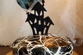 Trick or Cake, pour Halloween je vous présente un gâteau zébré aux couleurs d’halloween noir et orange avec une décoration sur le thème des araignées.